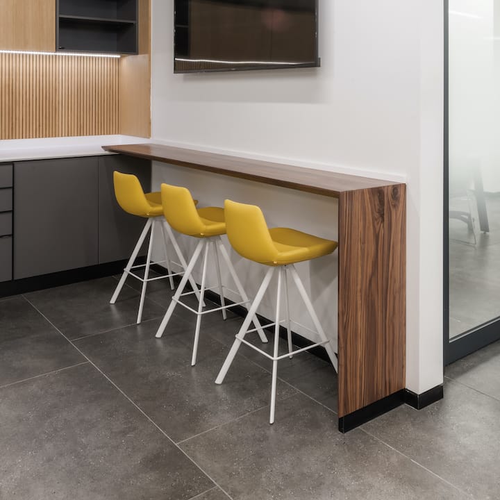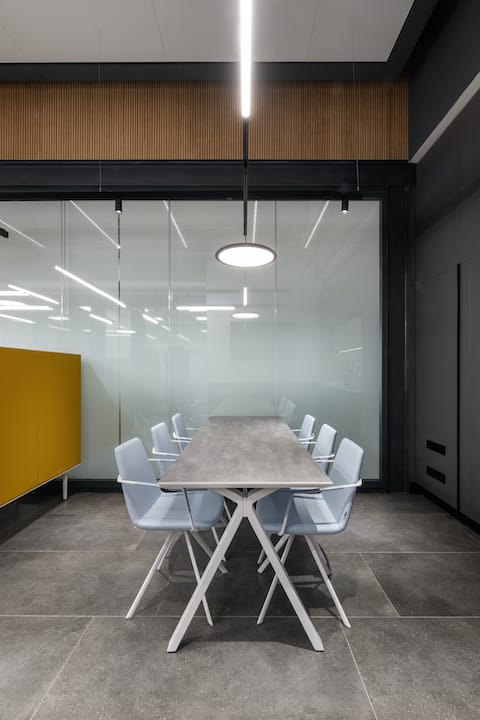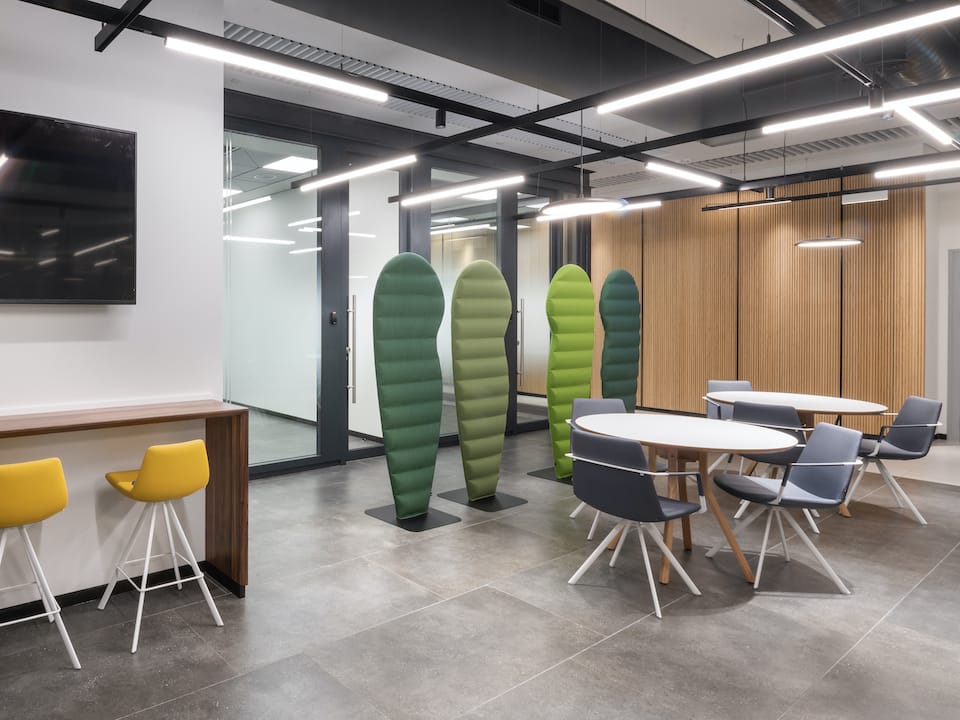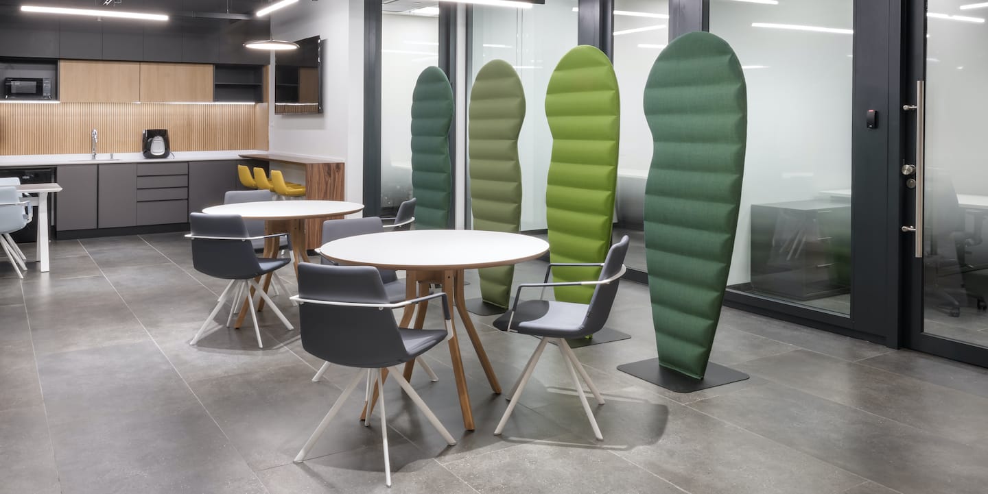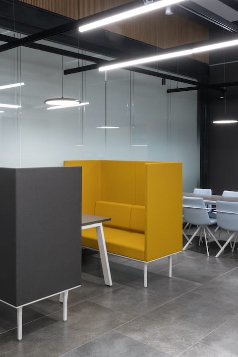 מרכז החדשנות של חברת הטכנולוגיה הגרמנית Merck ממוקם ביבנה, ועוצב על ידי משרד אדריכלים דונסקי + זוהר. המרכז כולל אזור משרדי, חדר ישיבות לחברי ההנהלה, קפיטריה ואזור ישיבה א-פורמלי עבור העובדים במקום. לאזור הקפיטריה נבחרה צבעוניות אפורה, עם זריקות צבע משמחות בדמות ספה צהובה Longo Pod ומחיצות אקוסטיות BuzziCactus מבית BuzziSpace.