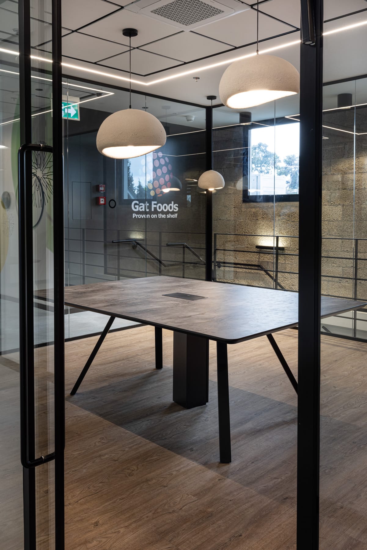 שימוש בגווני בטון וחיפויי טיח למראה חשוף, נקי ומודרני, אשר נכנסו גם לחדרי ביטחון – ממ”ד, שם הפך המקום לאודיטוריום עבור כנסים והרצאות של עובדי החברה ואורחים מחו”ל.