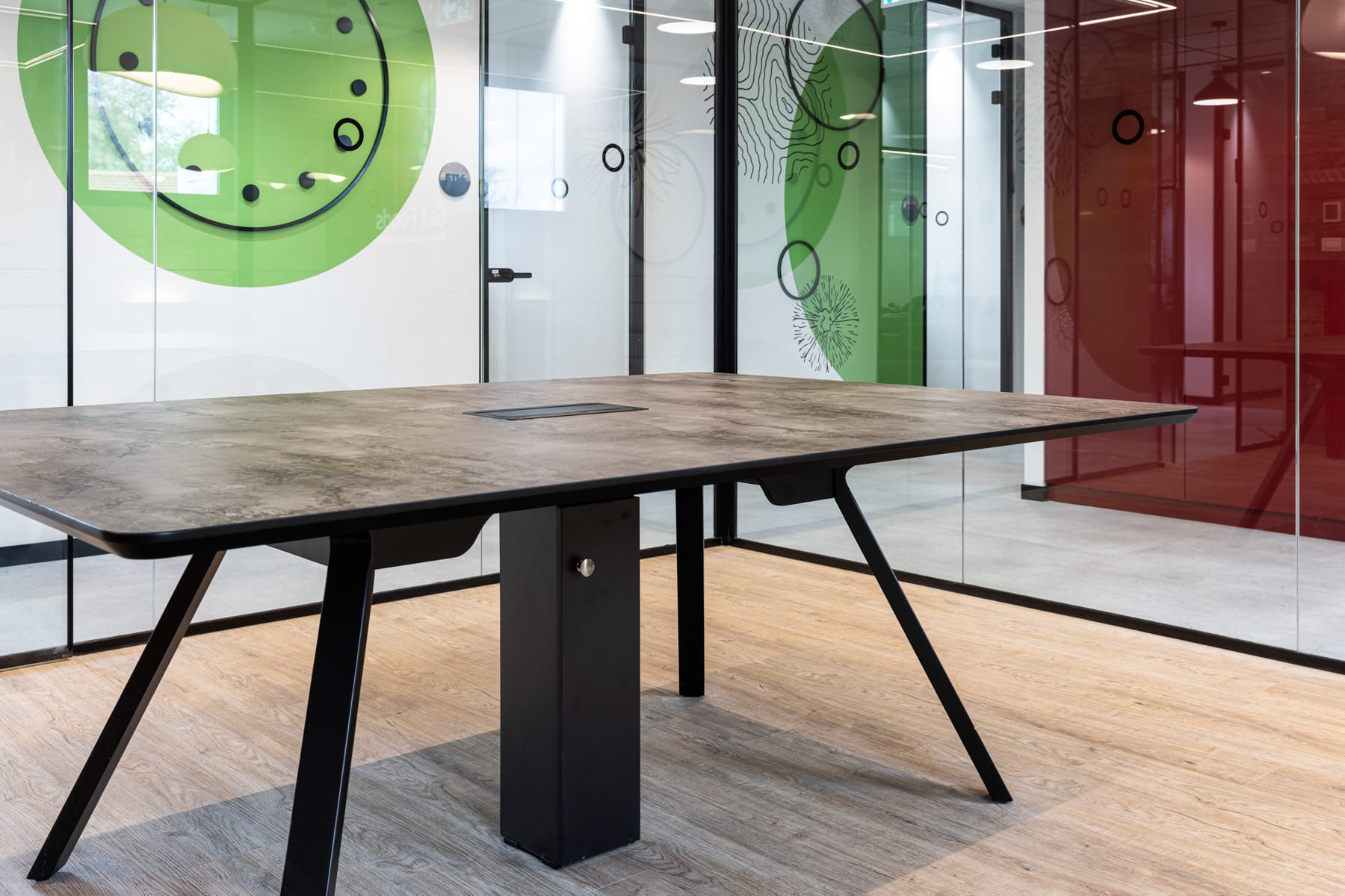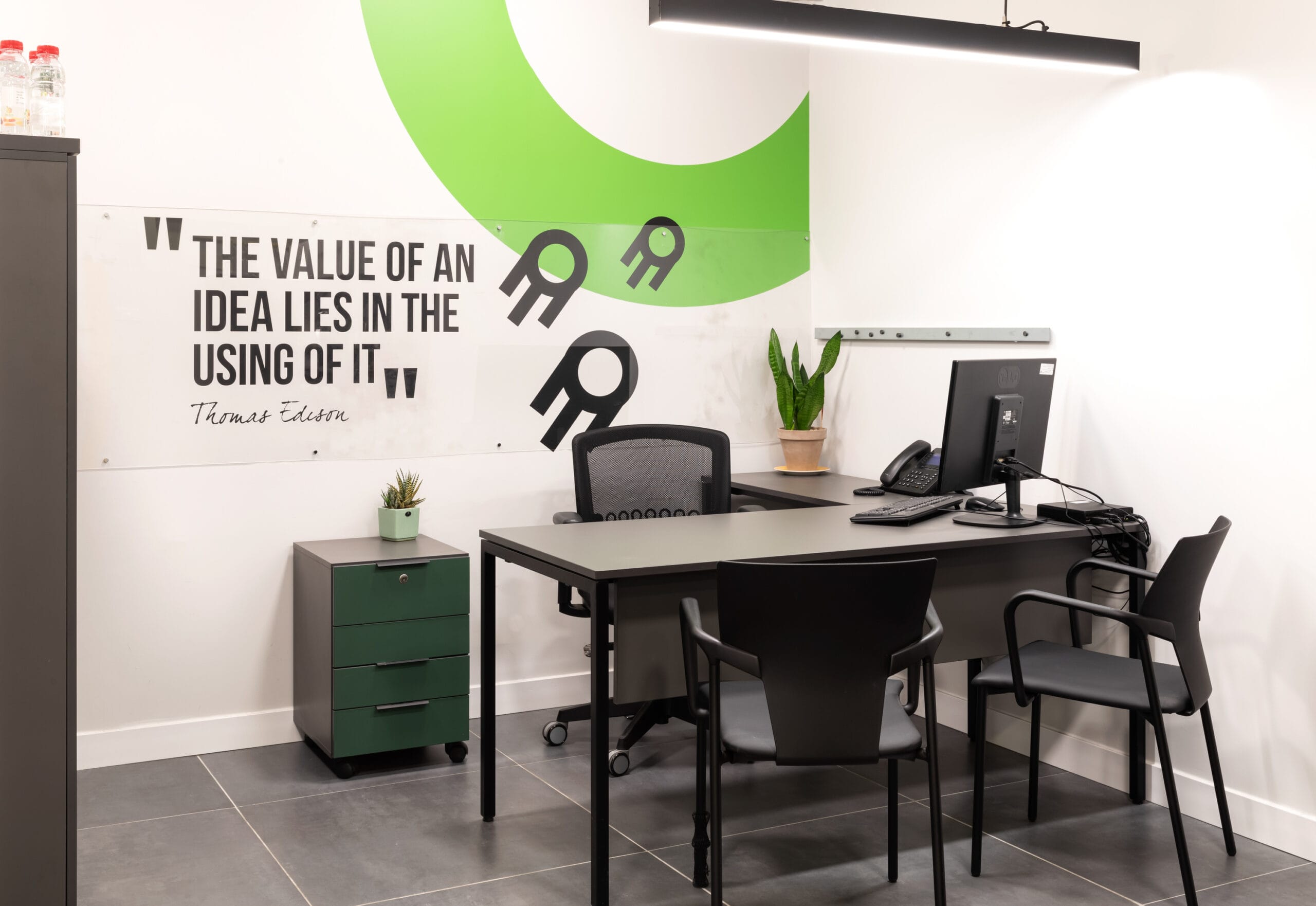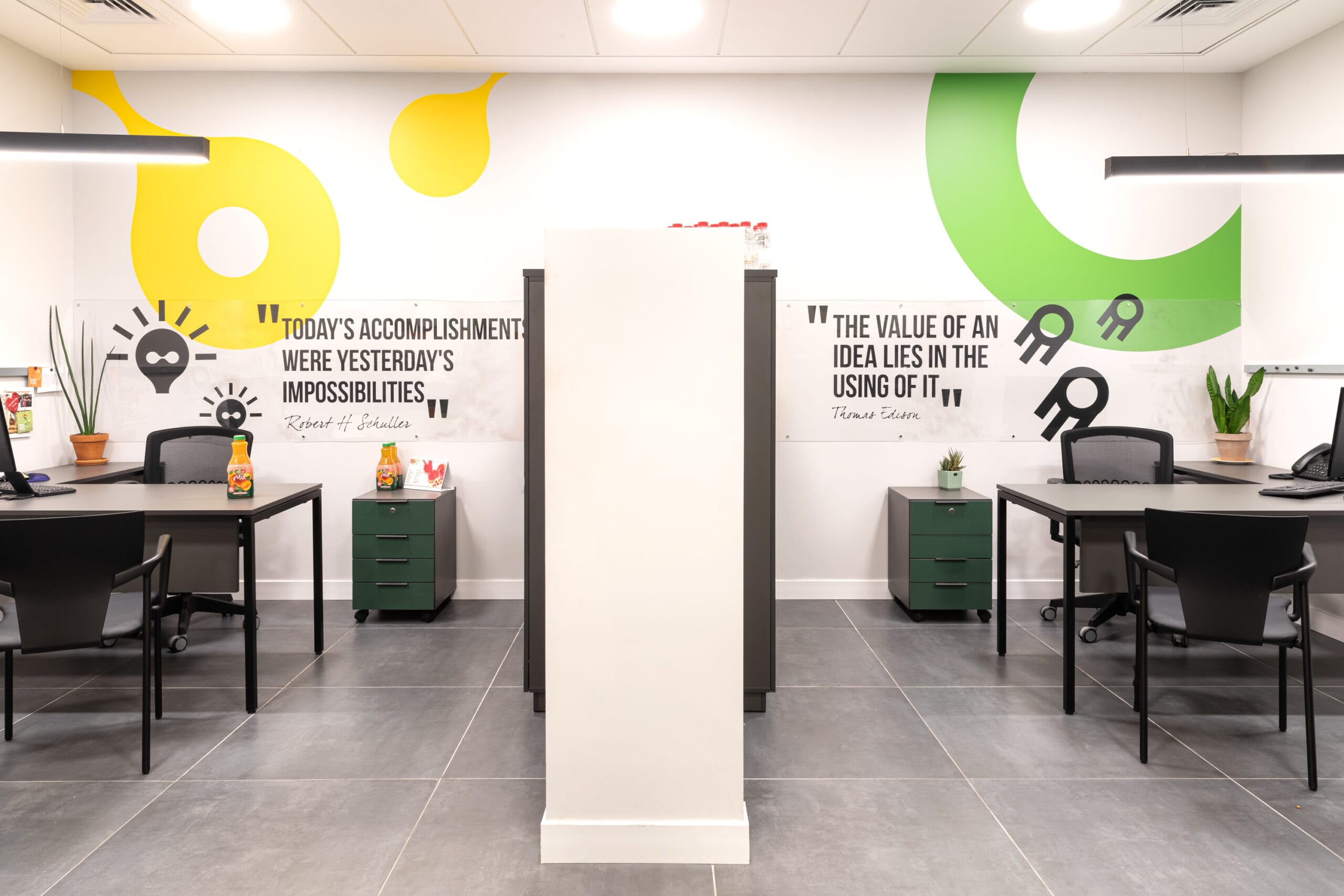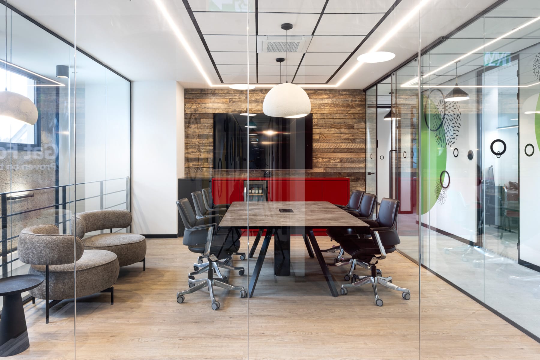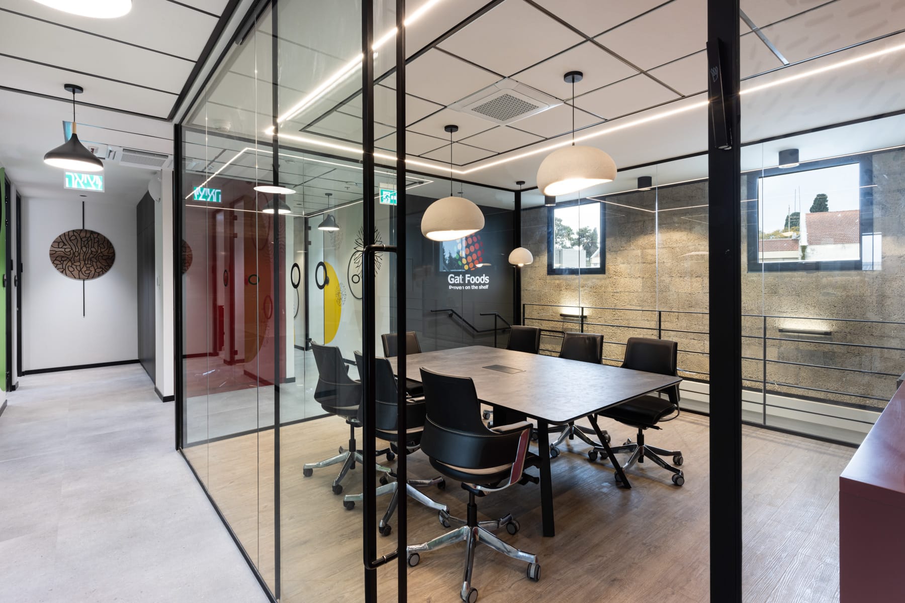 עיצוב החלל ובחירת הריהוט נעשו בקפידה מתוך מחשבה לשמור על הגוונים והשפה הגרפית המייצגים את חברת פריגת.