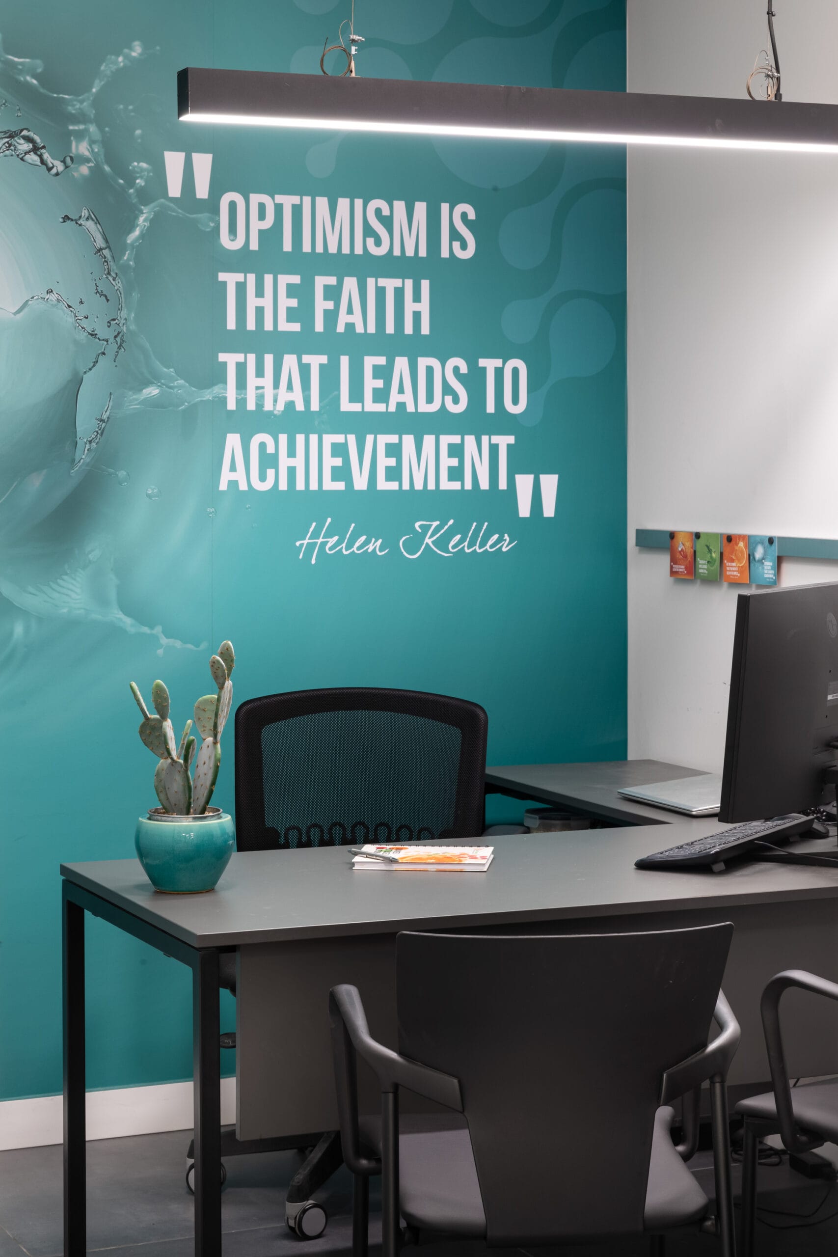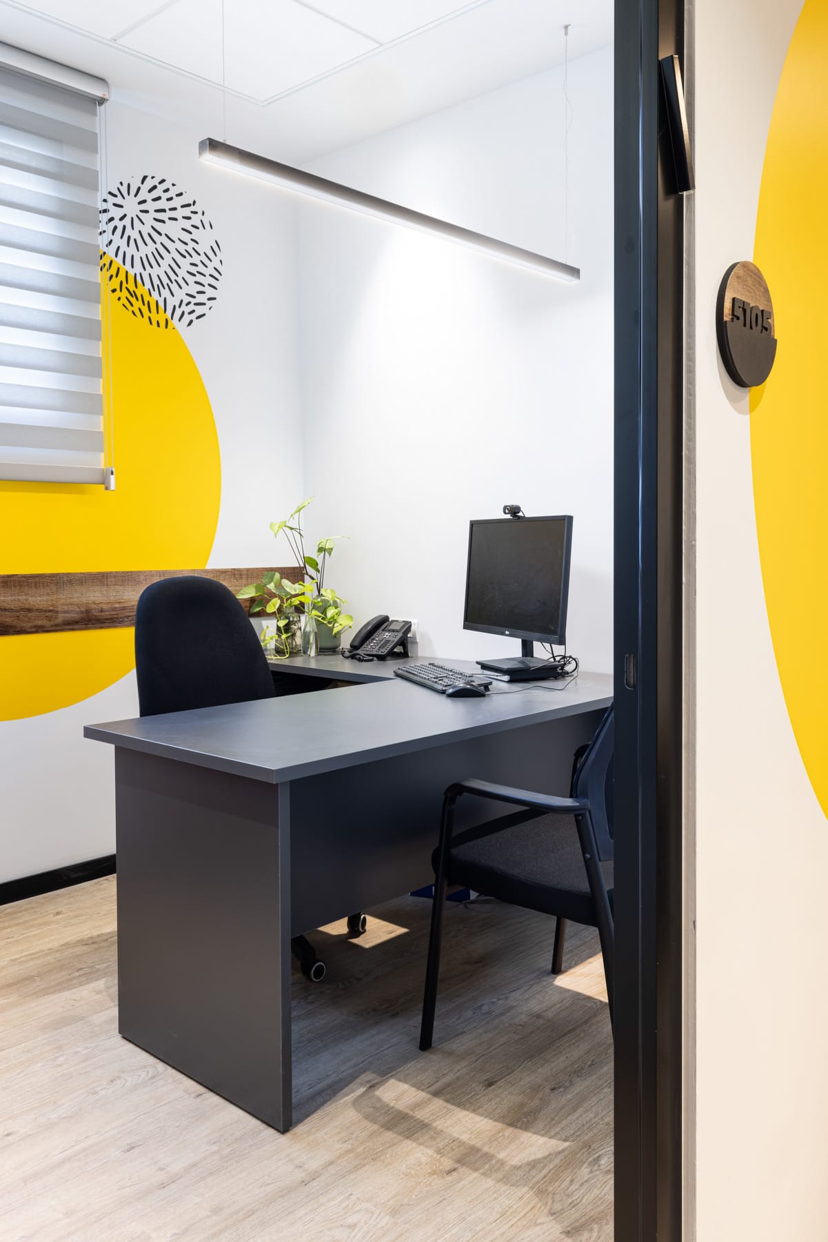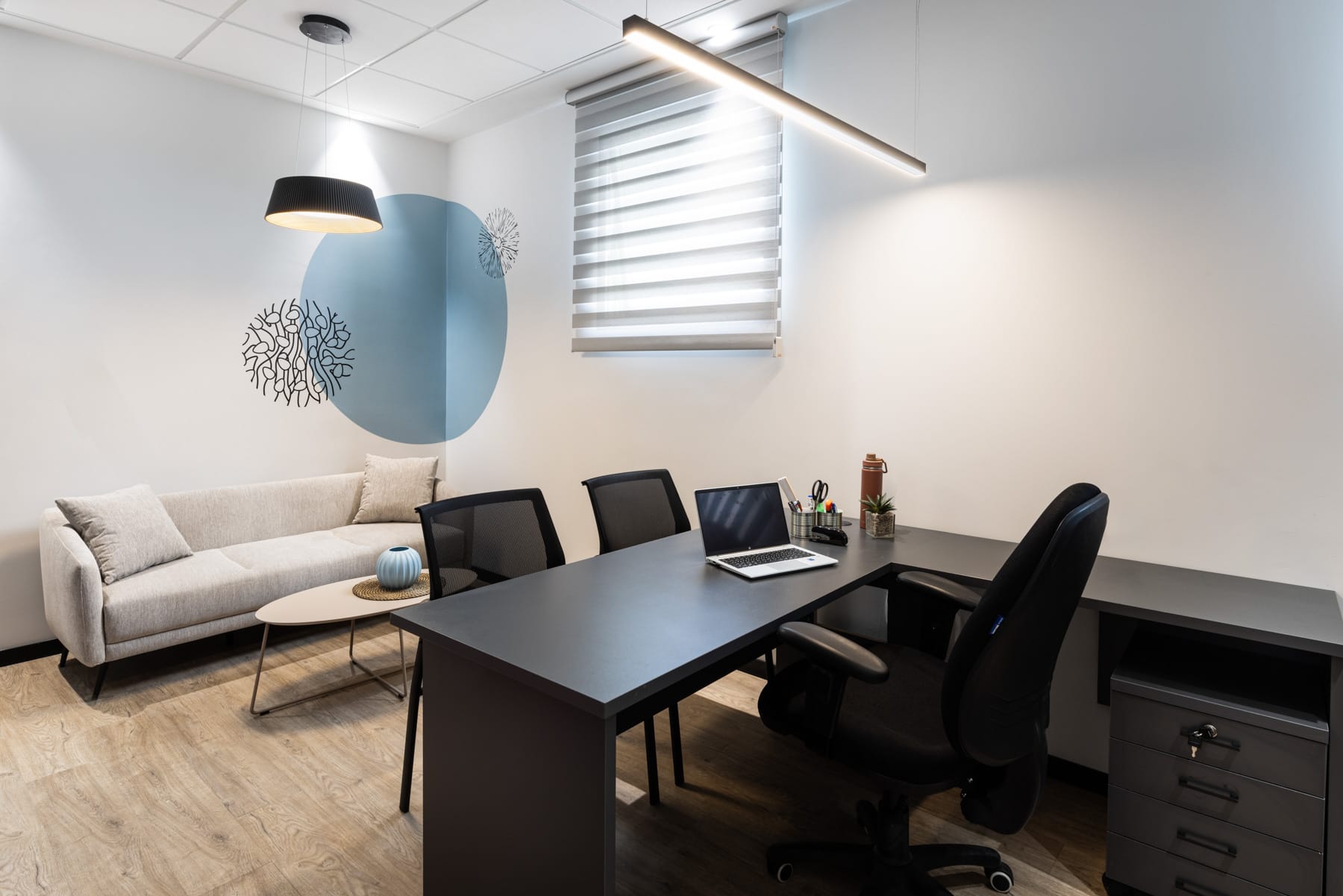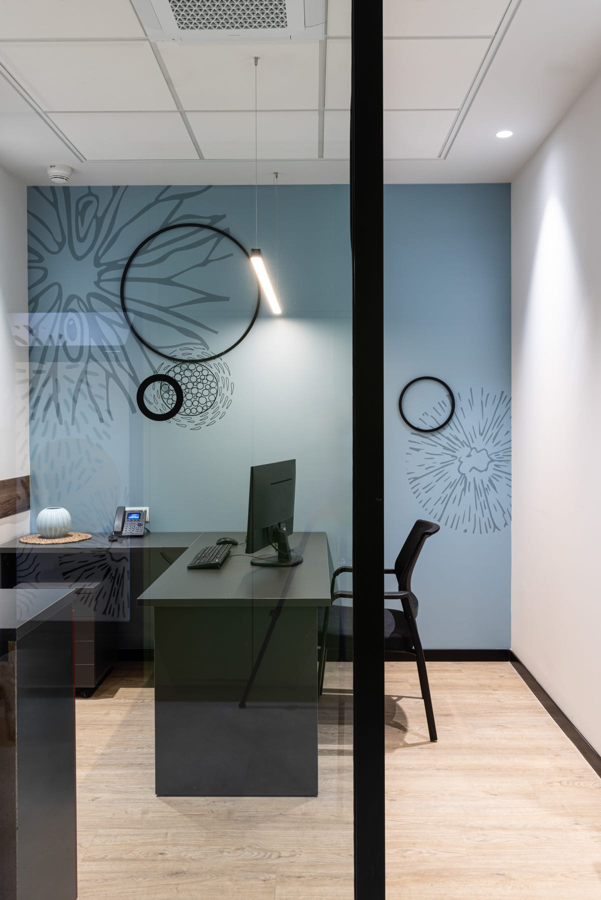 כל זאת עם תאורה נכונה ונעימה, מעוגלת ומשולבת עם אריחי אקוסטיקה עגולים המשרים רוגע וזרימה.