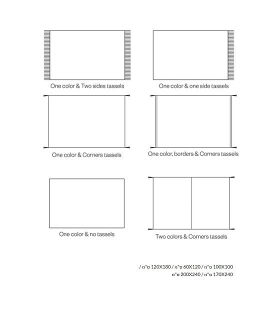 השטיחים זמינים במספר גדלים: 100x100 ס"מ; 60x120 ס"מ; 120x180 ס"מ; 170x240 ס"מ; 200x240 ס"מ.