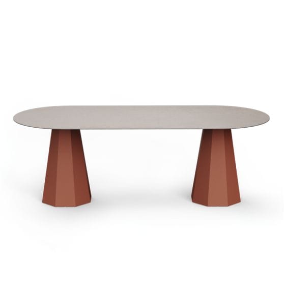 שולחן אוכל המתאים לחללי חוץ, אשר מתבלט בזכות הרגליים המסיביות התומכות במשטח מעוגל ודק. לשולחן מספר וריאציות והוא זמין בכמה צבעים וגימורים עכשוויים.
